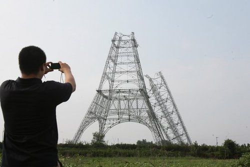 2009年7月23日,河北晋州近200米在建电视塔雨夜折断。崔华瑞 摄