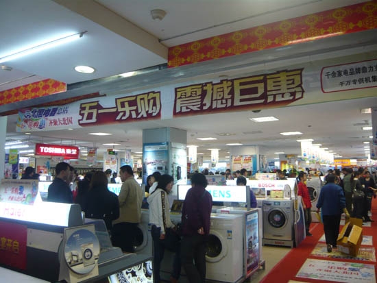 在北国电器卖场:空调专柜的营业员恨不得生出三头六臂,身着品牌形象装的临时促销员发宣传单页、引领顾客交款忙得不亦乐乎,;彩电专柜的营业员要不了几分钟就得喝上几口水,手机、电脑、相机柜台则被消费者围得满满当当……五一期间,北国电器各大卖场一派火爆的热销场面。4月29日北国电器北国总店单店销售1526万元,人满为患、出货量超多、价格超低,都让北国总店20多个收款台前围满了等待交款的消费者,次日凌晨2点关门还有消费者恋恋不舍地离开。