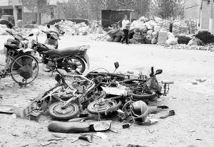 昨日10时30分,袁先生家聚集了数十位亲友,他们除了帮忙料理丧事,还要协助袁先生家人处理鞭炮爆炸的事儿。袁先生家门口紧邻一条街道,路旁有一堆烧焦的衣物,“雷弹爆炸,很多人的衣服着火,我们赶紧上去扒……”袁先生家院内还有两辆面目全非的电动自行车,其中一辆电动车前胎的钢圈被炸飞了,“共有四辆车受损严重,那两辆推到修车铺去了”。