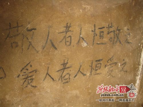 在张老汉家西屋的黄泥墙上,记者看到用粉笔工工整整地写着两行字:“敬人者人恒敬之,爱人者人恒爱之。”张老汉说,字是他自己写的,也是这么做的。