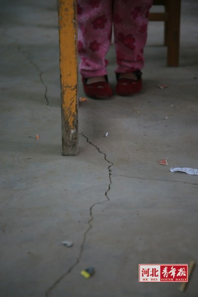 在二楼多个教室的墙壁及地面上均出现了裂缝,个别地方还有屋顶起皮的现象。一名老师称,那就是下雨时出现渗水的地方。