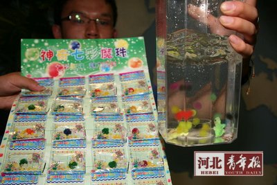 “海洋宝宝”石市有售昨日,记者在石市草场街小学附近的一家小商店发现,类似“海洋宝宝”的玩具挂在窗外待售。这些袋装的小珠子五颜六色,有的是热带鱼、海草的形状,手感类似胶质,闻起来有香味。