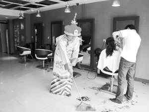 10时许,他看到范西路上某理发店的店员正在擦玻璃,佟德伟拿起抹布也擦了起来。擦完玻璃,佟德伟说明了来意,理发店老板很有兴趣地看着佟德伟的造型说:“你可以试试在我们这儿做门童。”