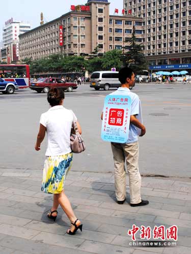 17日,在河北省会石家庄中山路与建设大街交叉口,有一个前胸后背各挂着一个广告牌子的小伙子,广告牌子上写着“广告招商”,引得过往市民驻足观看。