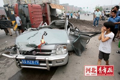 昨日11时许,石市天山大街与槐安路交口,一辆自卸车侧翻,洒下的沙石埋住一辆轿车。消防、市民齐上阵救援,但依然没有挽回这一家三口的生命。