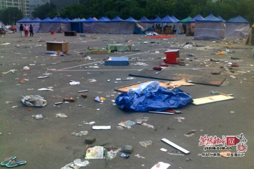 记者在现场看到,离场的商家将各种生活垃圾、剩饭、纸盒、木板随手一扔,更有甚者,破柜台也被扔在广场上。