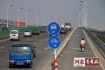 石市南环大桥下的汇祥路铁路桥即将施工,影响非机动车通行。昨日,石市交管局实地考察后,在原为快速路的南环大桥上开辟了两条非机动车道应急。由于此前南环大桥禁止非机动车通行,因此昨日先上桥的非机动车车主们有些忐忑,了解情况后表示此举很方便。