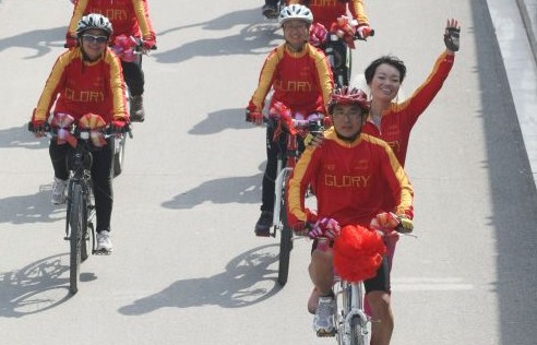 正说着,石家庄捷安特车友会的队友们穿着整齐的红色队服“浩浩荡荡”欢呼而至。车友会有一个QQ群,群里活跃着几百名自行车爱好者,“石家庄方圆200公里以内的景点几乎骑遍了。”群主是一位叫“居士”的男士,面色黝黑,说起话来十分干脆爽快,“半个多月前,两位新人在群里招呼了一嗓子:我们要结婚啦,大家有什么好点子没有?”“居士”回忆:“车友会的朋友们别的没有,车有的是,而且都是热心人。所以当有人提议说,就来个自行车婚礼如何?一呼百应,大家纷纷报名参加。”