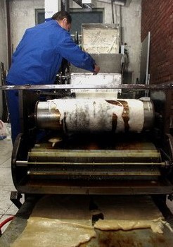 15时10分许,约30斤面粉加入到面粉输送机后,烙饼机转、和面机搅、挤面机挤、加热带传送、给油器抹油、液化气燃棒加热……5分钟后,热腾腾的饼出炉了。黄灿灿,油光闪闪,参与试验的饼铺老板杨玉所尝后竖起大拇指,说:“劲道。”